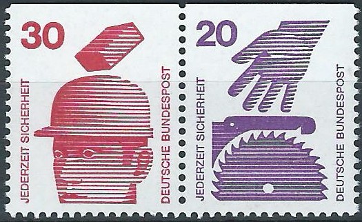 aus der Serie Unfallverhütung haben wir hier die Werte zu 30 und 50 Pf als Rollenende 1 + 4, also je eine Einzelmarke mit 4 anhängenden Leerfeldern. Gestempelt wurde in Rheda-Wiedenbrück mit einem Sonderstempel am 23.3.85.