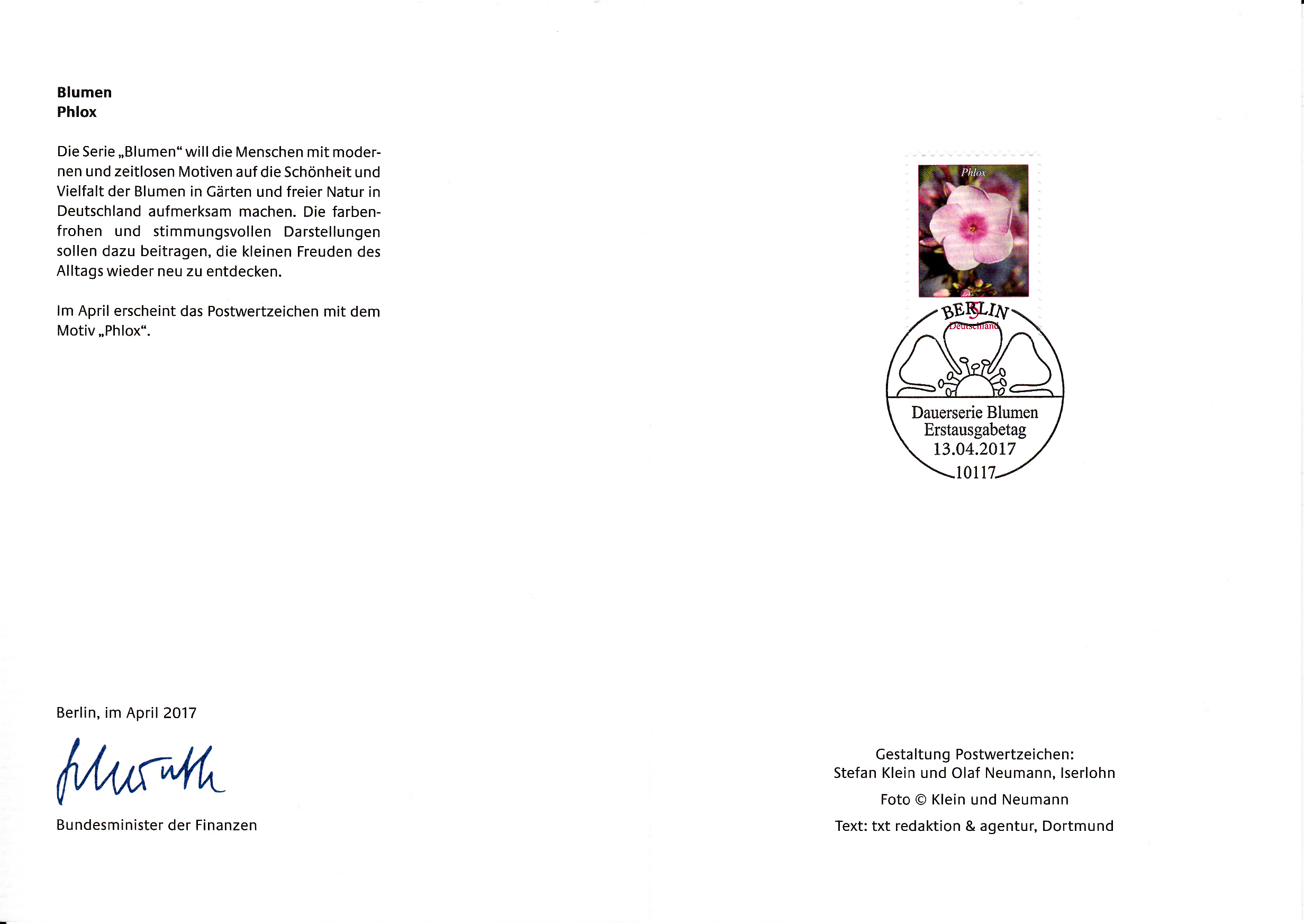 Ministerkarte des Finanzminister mit der 5 Cent-Marke Phlox (MiNr 3296) der Deutschen Post und dem Ersttagsonderstempel Berlin.