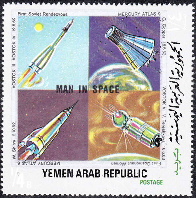 Im Jemen-Nord erschien 1969 in einer Serie "Bemannte Raumfahrt" diese Marke (MiNr 946), die auch an den Flug von Mercury 8 von W. Schirra erinnert (unten links).
