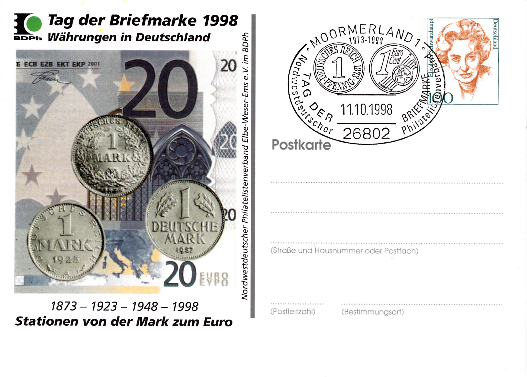 Ganzsache des Nordwestdeutschen Philatelistenverbandes Elbe-Weser-Ems e.V. mit dem dazu passenden Sonderstempel vom 11.10.1998 aus Moormerland zum Tag der Briefmarke 1998.