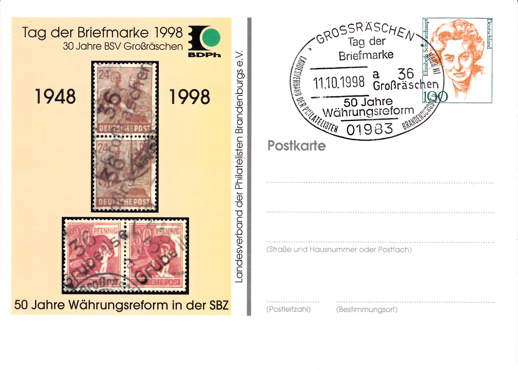 Ganzsache des LV der Philatelisten Brandenburgs e.V. mit dem dazu passenden Sonderstempel vom 11.10.1998 aus Grossräschen zum Tag der Briefmarke 1998