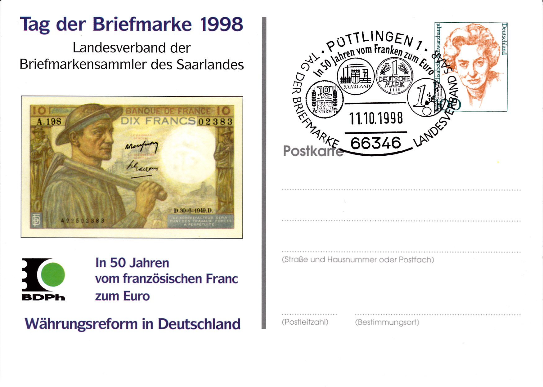 Ganzsache des LV der Briefmarkensammler des Saarlandes e.V. mit dem dazu passenden Sonderstempel vom 11.10.1998 aus Püttlingen zum Tag der Briefmarke 1998.