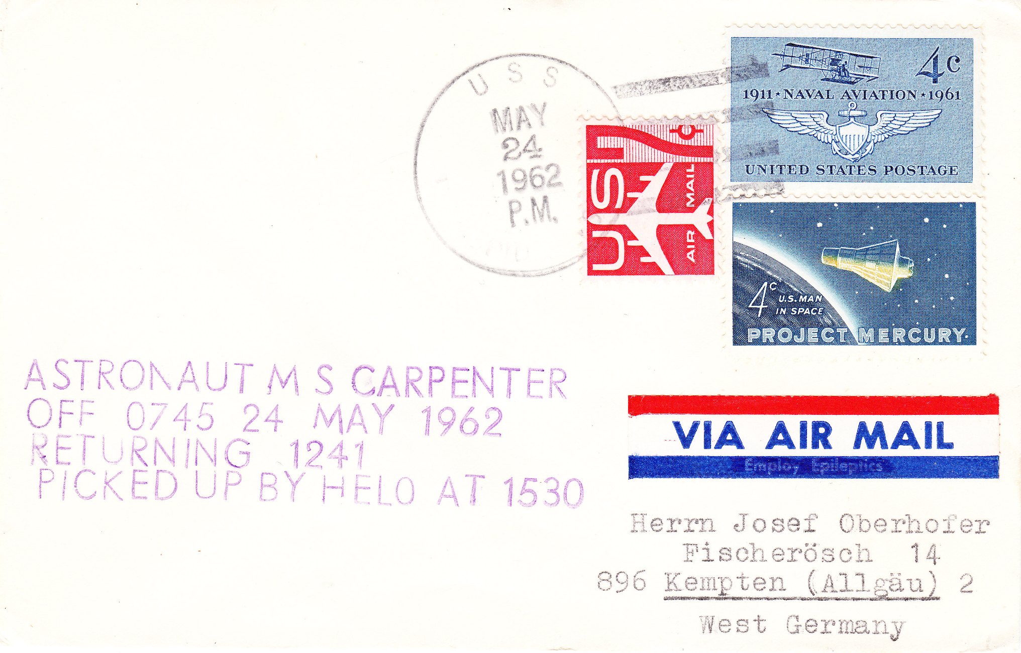 Diese Aktion dokumentiert dieser Beleg mit einem entsprechenden Cachetstempel sowie einer zum Thema MERCURY passenden Briefmarke, die an Bord der USS INTREPID CVS-11 entwertet wurde: