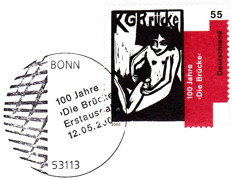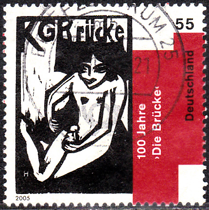Zum Jubiläum "100 Jahre Die Brücke" ist diese Marke bei der Deutschen Post erschienen (MiNr 2458). Als Motiv wurde die "Sitzende Fränzi" nach einem Holzschnitt von Erich Heckel ausgewählt. Es ist zwar jetzt kein "Gemälde" im eigentlichen Sinn, aber ich stelle es trotzdem hier mit ein, da das Werk zu den Arbeiten des Malers Erich Heckel gehört!