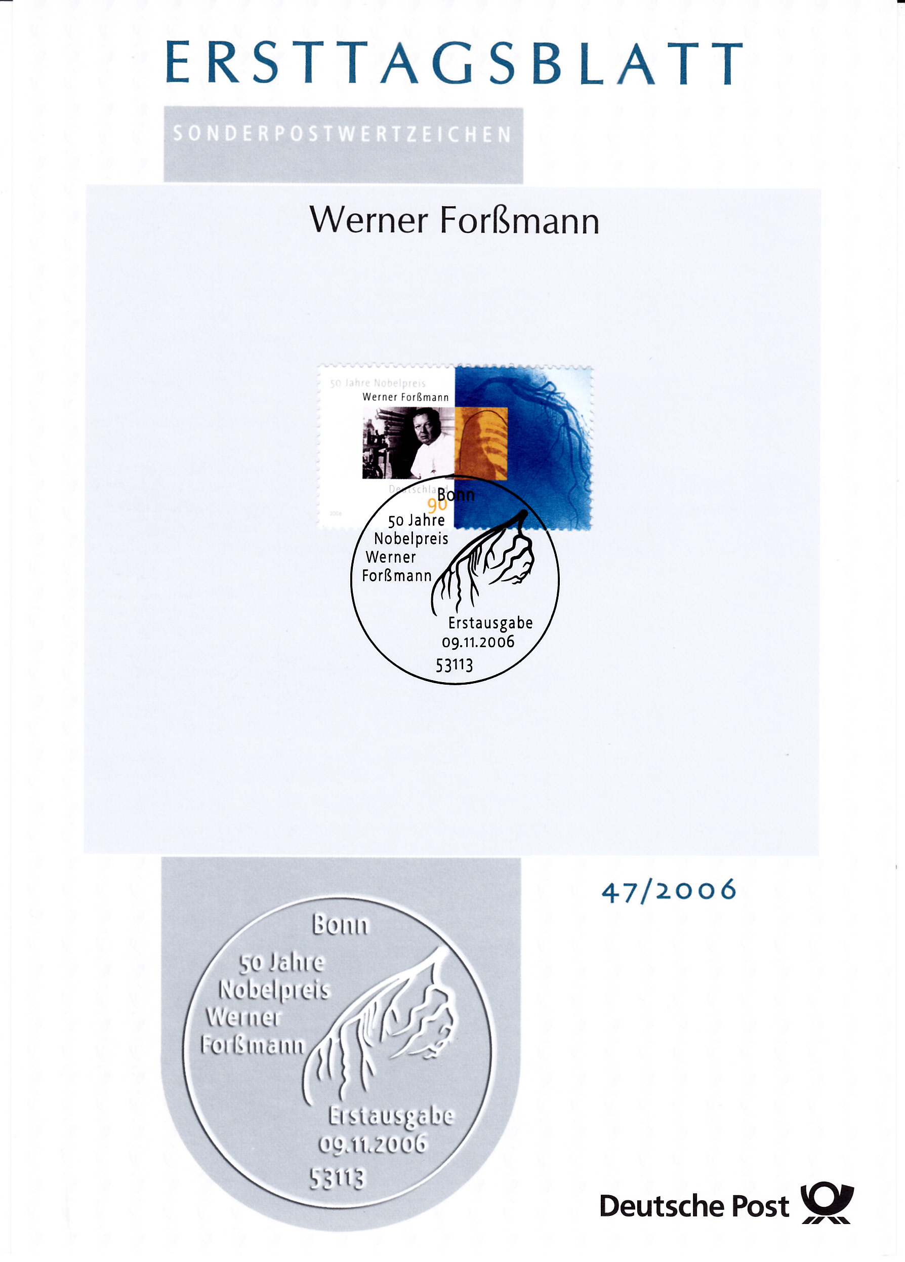 Ersttagsblatt der Deutschen Post mit dieser Marke. Auf der Rückseite sind einige Informationen zu Werner Forßmann nachzulesen.