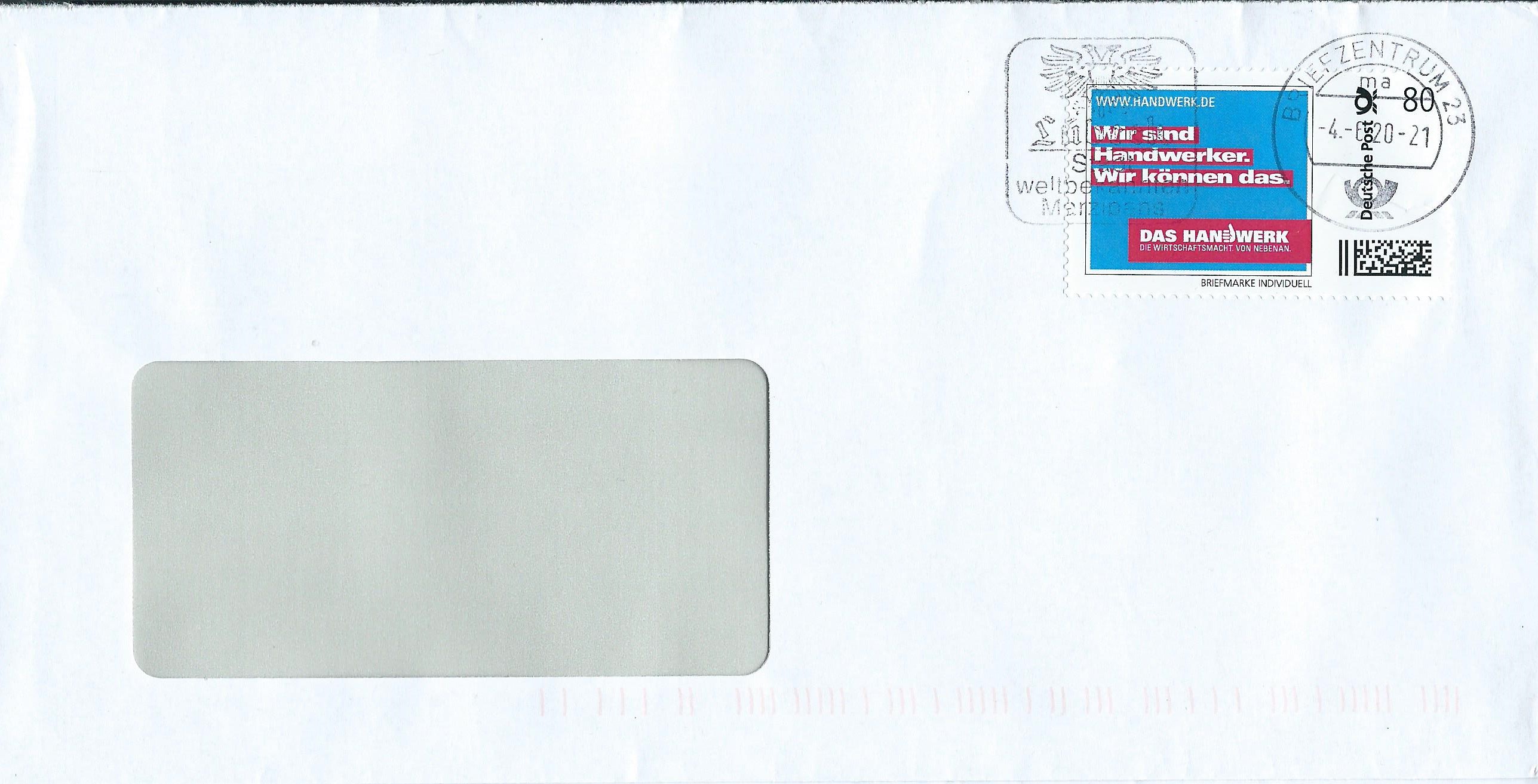 die Marke Individuell aus der schon früher gezeigten „Serie“ Handwerker: Hier als 80 Cent-Wert mit dem Slogan „Wir sind Handwerker, wir können das“ auf Brief, gestempelt am 4.6.20 im Briefzentrum 20: