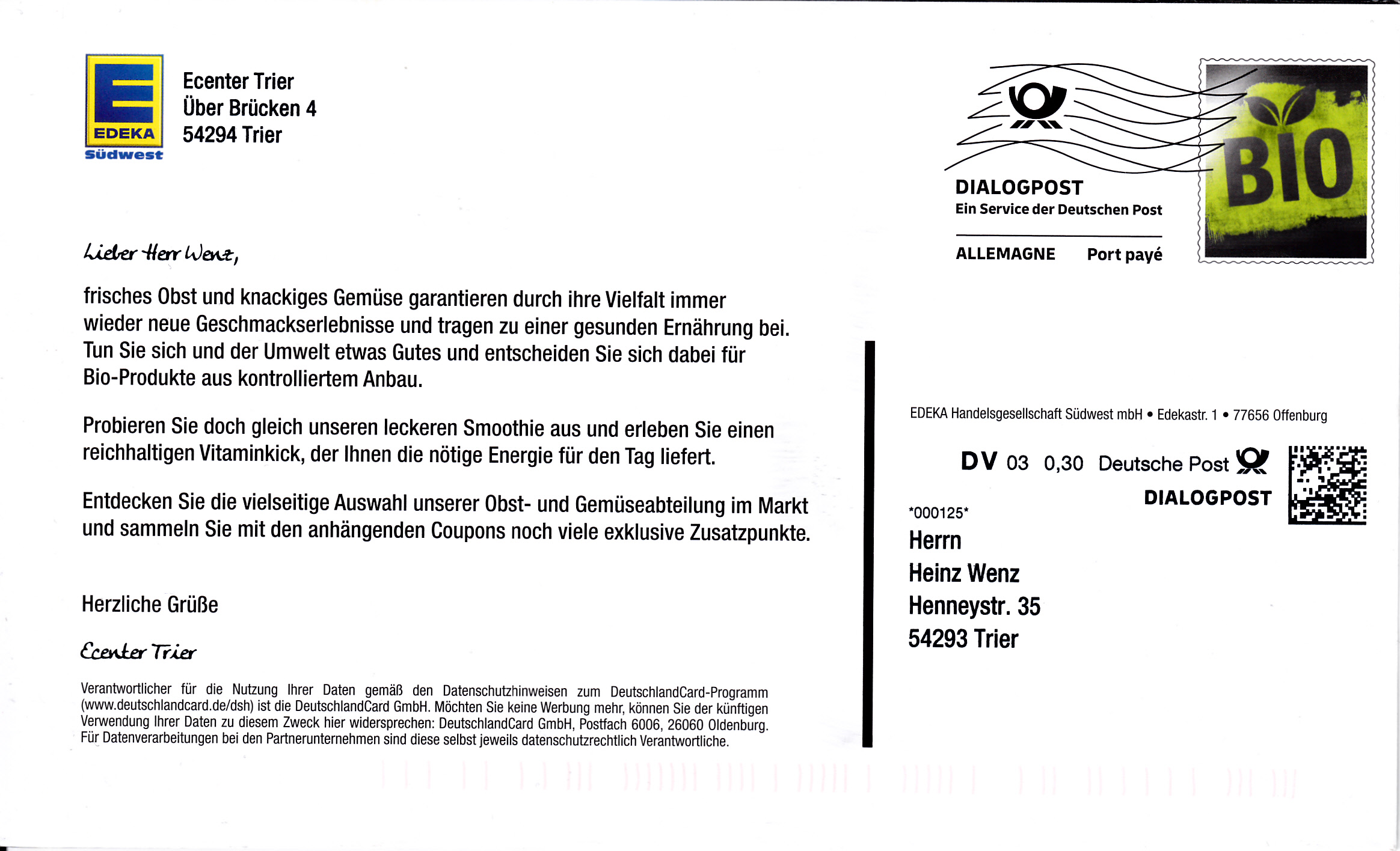 Dialogpost des Edeka-Center Trier mit einem Wertstempelähnlichen Zudruck mit dem Motiv "Biopodukte".