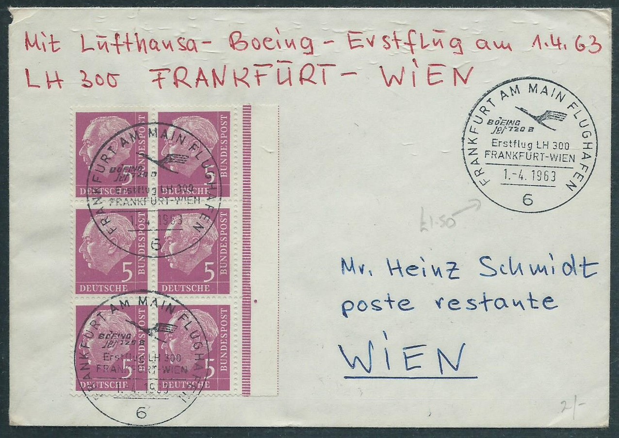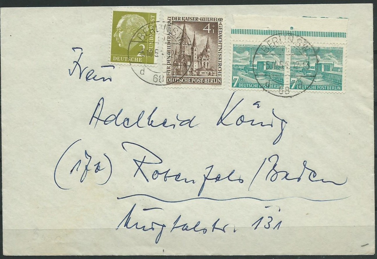 Hier im senkrechten 6-er-Block mit rechtem Seitenrand auf Beleg. Auffallend neben der Strichelleiste der Nadelpunkt und ganz aussen die Schnittmarkierung. Bislang war mir die Trennungslinie nur am linken Rand bekannt, nun kann ich sie auch rechts belegen. Für mich war nur dumm, dass es sich um einen Erstflug-Beleg handelt, mit 30 Pf ins Ausland richtig frankiert. Dadurch wurde das Teil leider etwas teurer, da der Händler auf solche Belege spezialisiert war. Mich interessierte ja "nur" die Markeneinheit samt Rand ;)