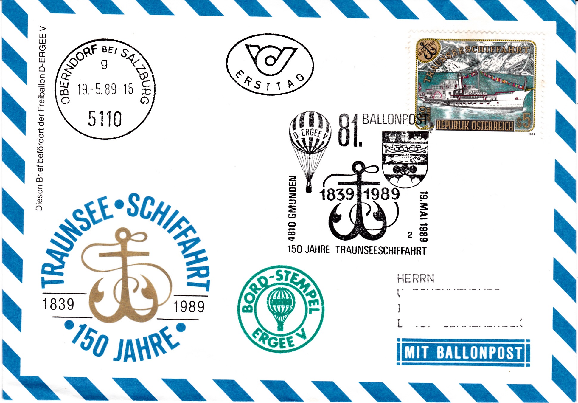 Dieser Brief wurde am 19.5.1989 in Gmunden für den 81. Ballonpostflug der Österreichischen Pro Juventute mit dem Freiballon D-Ergee V aufgegeben. Er erhielt den Sonderstempel mit der Kennziffer "2" aus Gmunden zu diesem Ballonflug und wurde am gleichen Tag mit dem Freiballon D-Ergee V befördert. Er erhielt zusätzlich den Stempel "Ersttag", einen Tagesstempel Oberndorf bei Salzburg und einen Bordstempel.