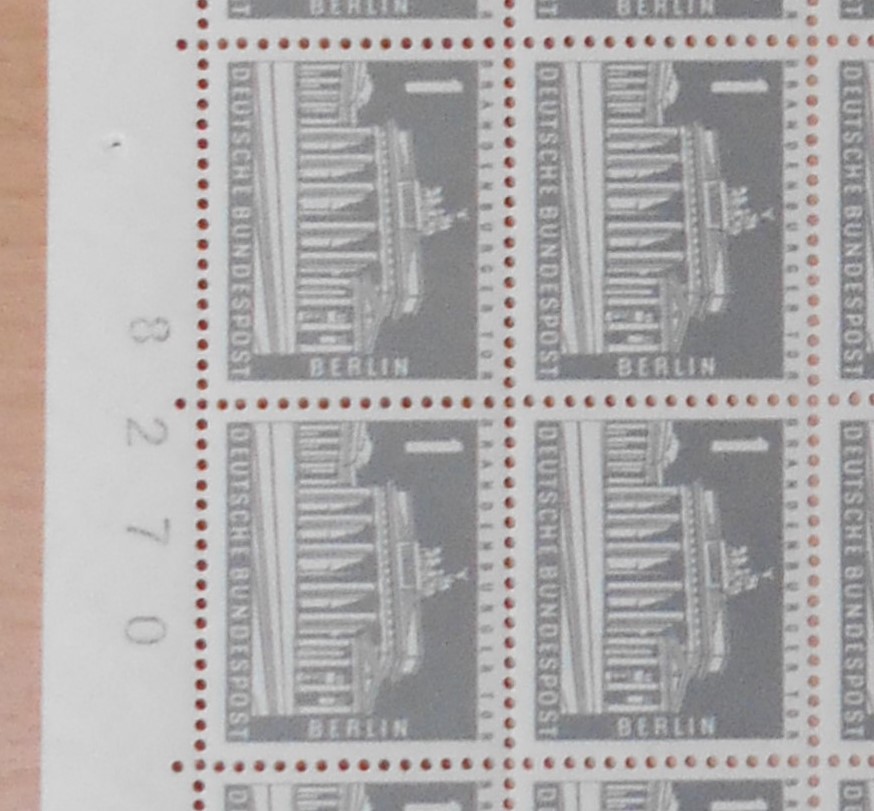 von der Marke zu 1 Pf y habe ich hier noch einen 4-er-Block vom linken Seitenrand mit Bogenzählnummer auf einer Stempelvorlagekarte. Gestempelt wurde mit einem Sonderstempel Berlin am 24.3.63.
