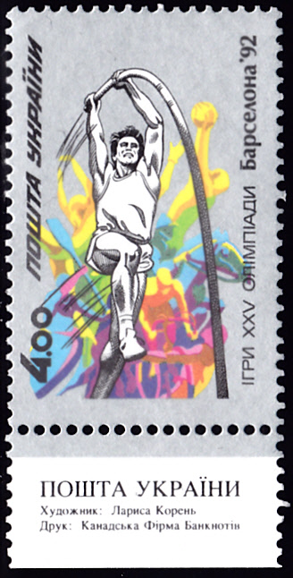 Eine zweite Marke aus der Ukraine (MiNr 84) wird im Vordergrund ein Stabhochspringer gezeigt.