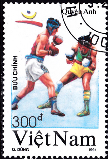 Aus einer Serie zu den Spielen 1992 in Barcelona aus Vietnam kann ich diese Marke (MiNr 2282) mit zwei Boxer im Kampf zeigen.