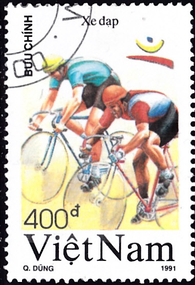 Diese Marke aus der gleichen Serie (MiNr 2283) zeigt zwei Radrennfahrer beim Straßenrennen.