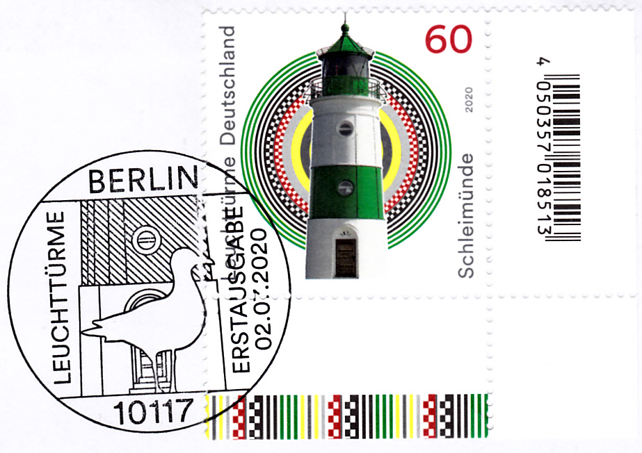 Für die selbstklebende Marke mit dem Leuchtturm Schleimünde gab es wie üblich in Bonn einen eigenen Erstverwendungssonderstempel.
