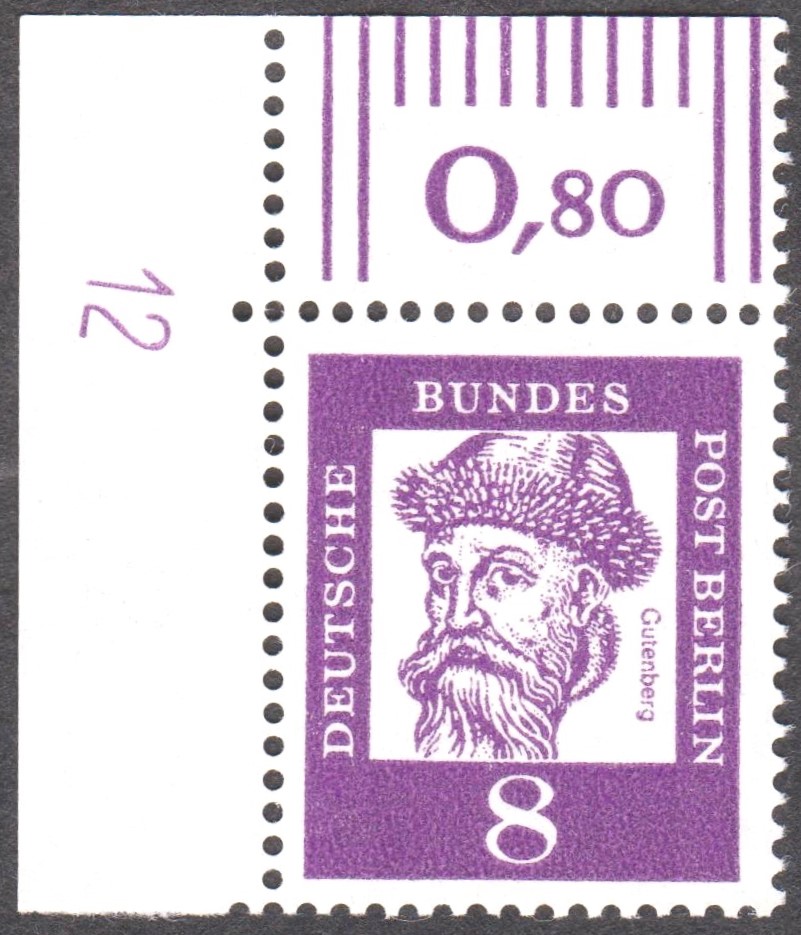 Dauerserie Bedeutende Deutsche, Ausgabe Berlin, Bogenecke oben links (= Bogenfeld 1) der Wertstufe 8 Pf mit Druckerzeichen "12", Berlin MiNr. 201 DZ 12: