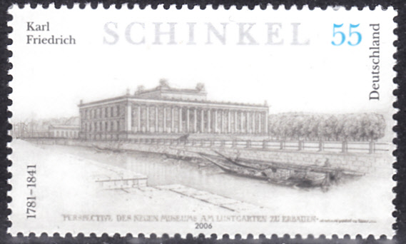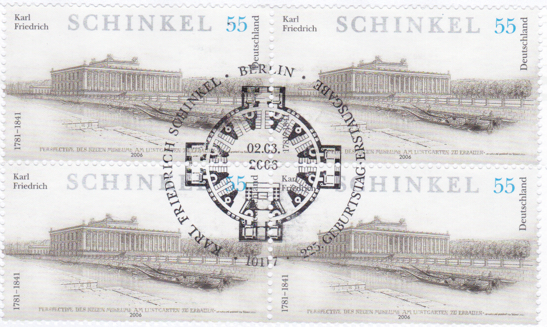 Zum 225. Geburtstag von Karl Friedrich Schinkel ist bei der Deutschen Post eine Marke (MiNr 2527) erschienen. Sie zeigt das Alte Museum in Berlin nach einer Entwurfskizze von K. F. Schinkel.