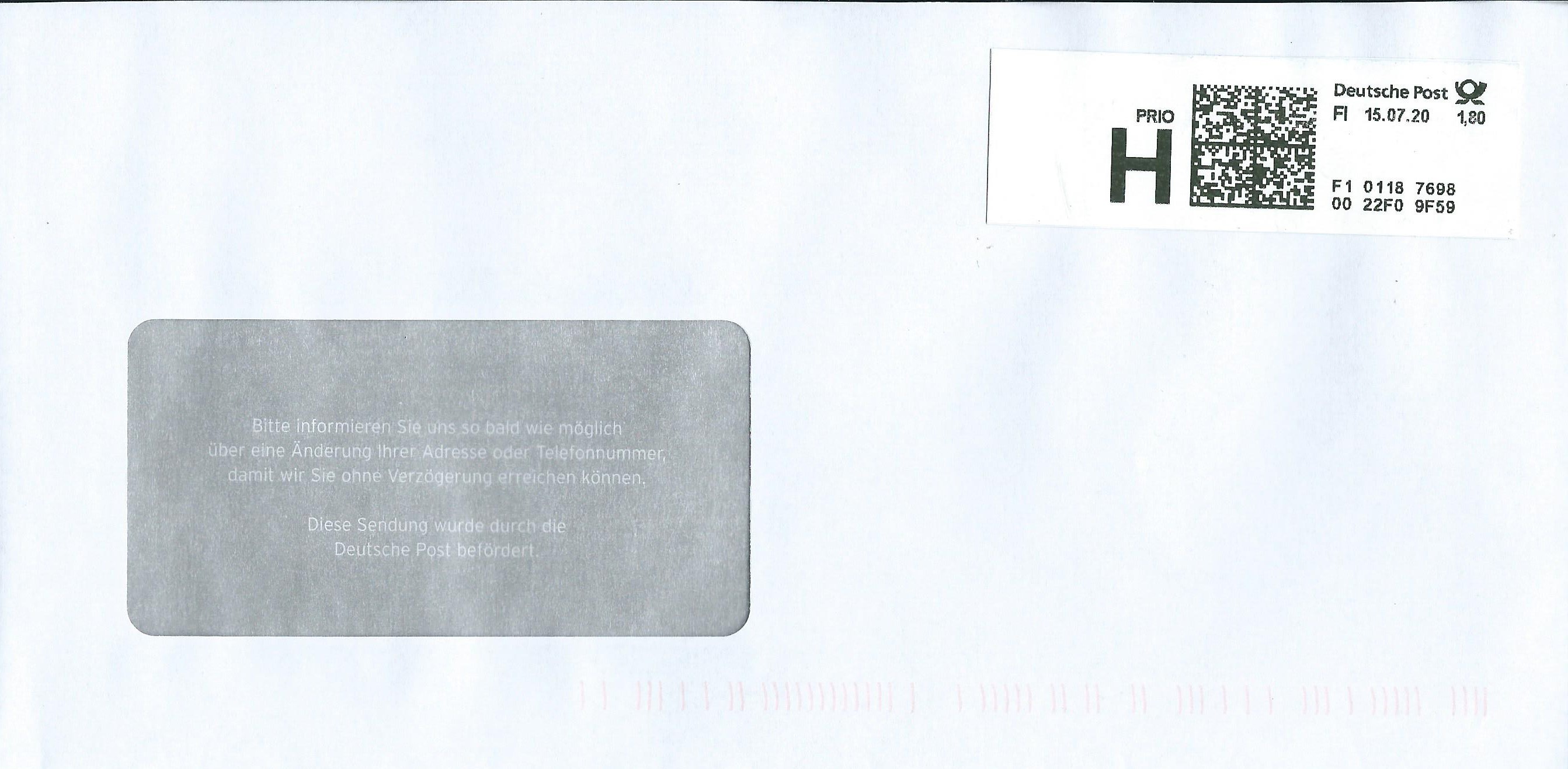 Bei diesem Priobrief vom 9.10.2020 fehlt auf dem Frankierlabel der Zusatz "H", dafür wurde ein zusätzliches Label ohne Porto auf dem Brief verklebt.