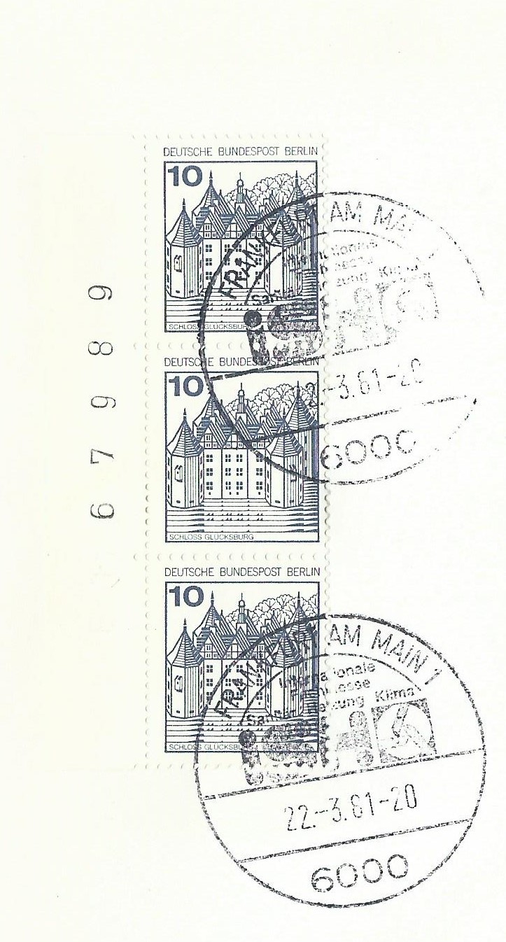 Der Wert zu 10 Pf vom linken Bogenrand als senkrechter 3-er-Streifen mit Bogenzählnummer auf einem Briefausschnitt, gestempelt mit einem Sonderstempel von Frankfurt am Main vom 22.3.81: