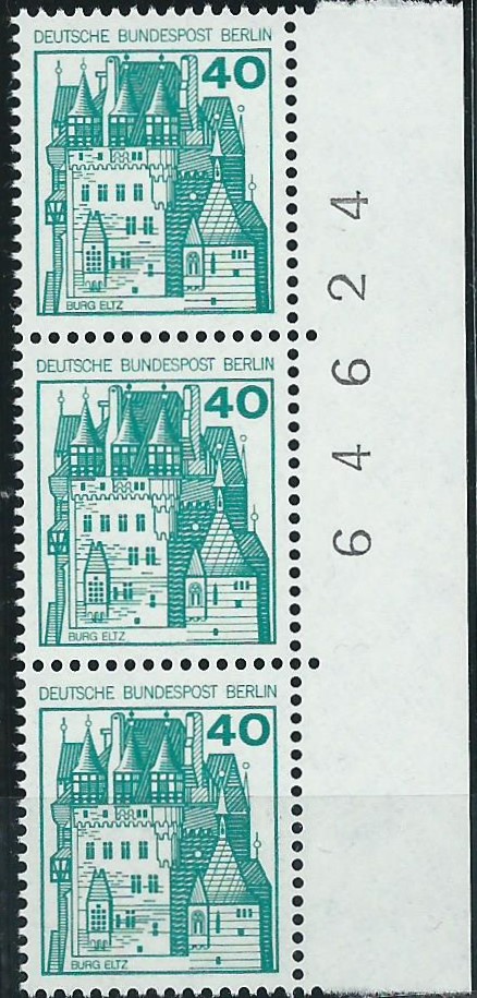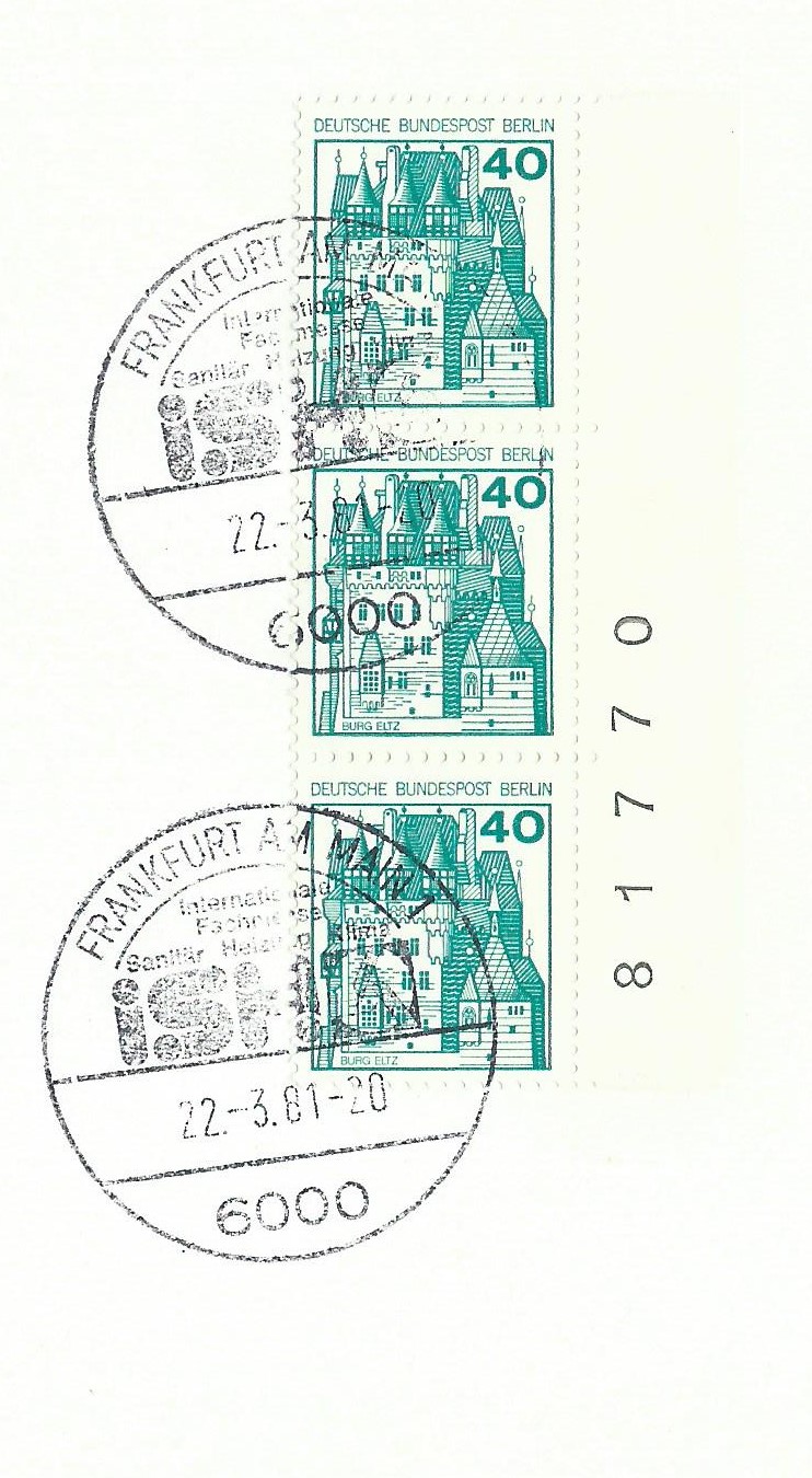 Der Wert zu 10 Pf vom linken Bogenrand als senkrechter 3-er-Streifen mit Bogenzählnummer auf einem Briefausschnitt, gestempelt mit einem Sonderstempel von Frankfurt am Main vom 22.3.81: