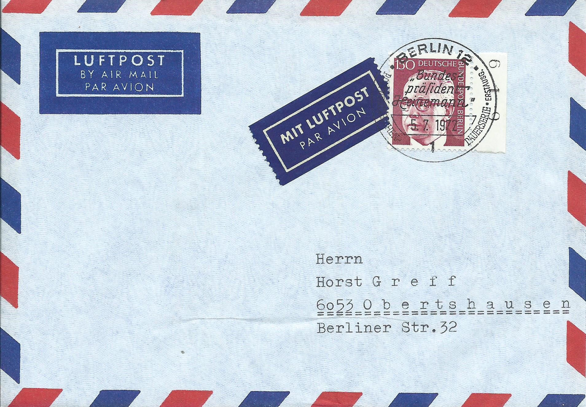 Ein Oberrandstück zu 130 Pf mit Reihenwertzähler 39,00, ebenfalls auf einem Luftpostbrief. Gestempelt wurde am 20.6.72 mit dem Ersttagssonderstempel Berlin.