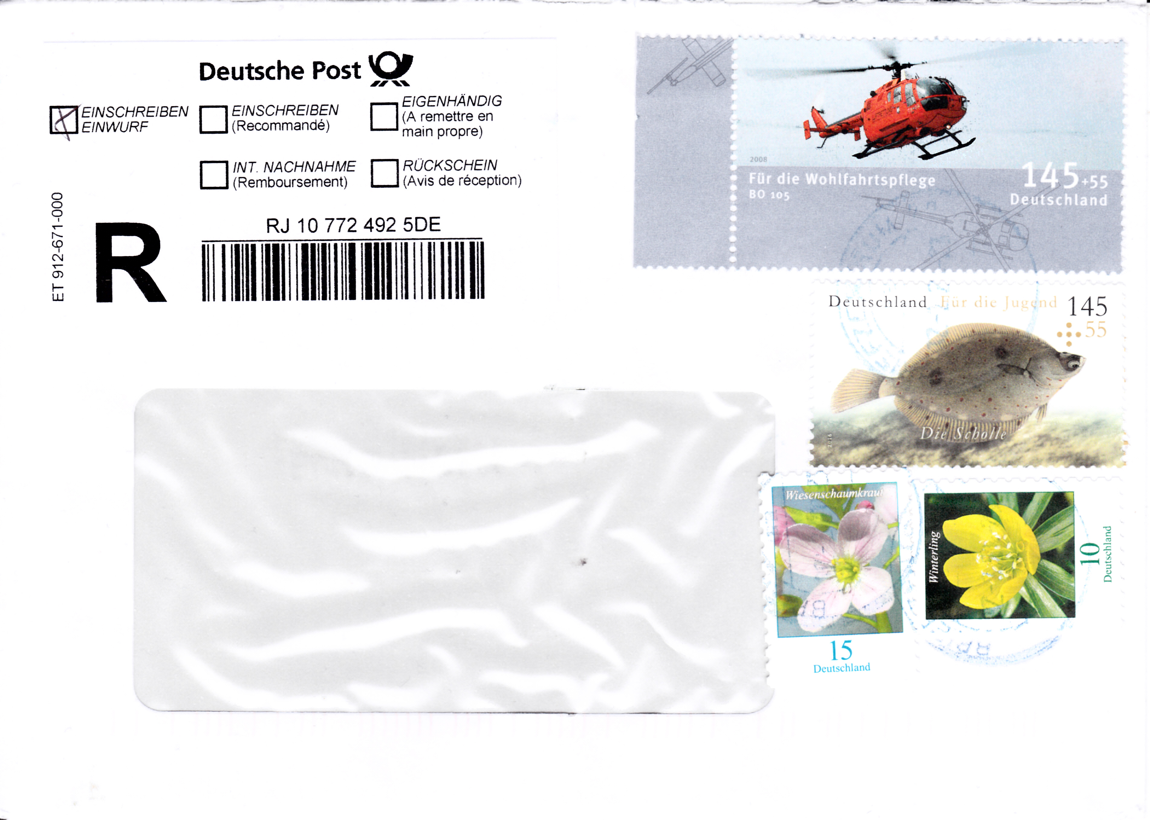 Dieser Brief von 21bis 50g im Standardformat mit Einwurfeinschreiben (Porto Brief 95 Cent, Einwurfeinschreiben 220 Cent, zusammen 315 Cent) wurde am 12.2.2021 in einem Briefzentrum mit einem Stempel in blauer Farbe gestempelt. Die blaue Stempelfarbe ist beim Scan auf dem weißen Hintergrund der Jugendmarke kaum zu erkennen (im Original ist der Stempel dort lesbar).