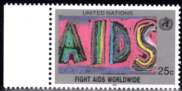Auch bei der Postverwaltung der Vereinten Nationen Genf erschienen 1990 Marken zur " Weltweiten Aidsbekämpfung". Auf der Marke zu 0,50 Franken (MiNr 184) sehen wir die Inschrift "SIDA".