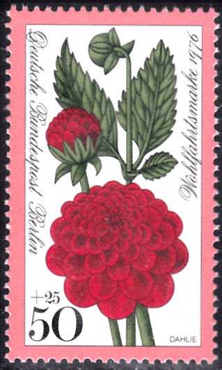 Auf den Marken aus der DDR zur Internationalen Gartenbauausstellung (IGA) in Erfurt werden Dahlien-Züchtungenb vorgestellt. Auf der Marke zu 10Pf (MiNr 2435) wird eine Semikaktus-Dahlie mit dem Namen "Rubens" gezeigt.
