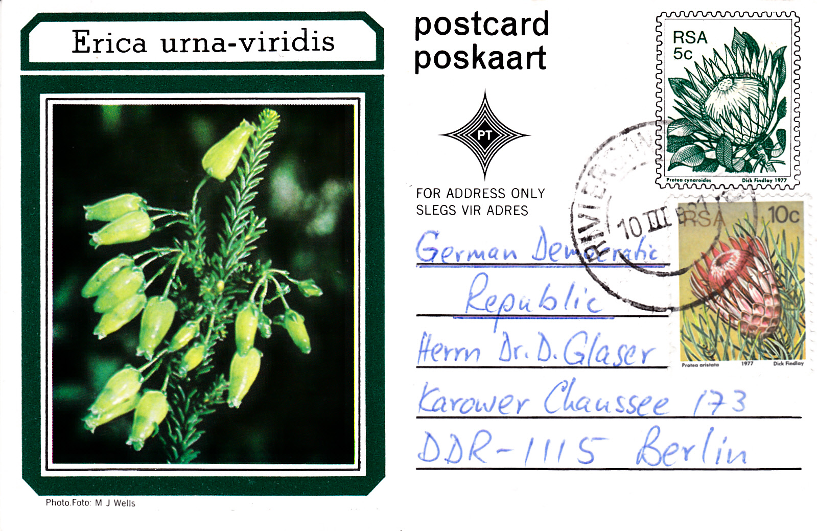 Diese Ganzsache, eine Postkarte aus Südafrika (= RSA) zeigt ein Foto einer Erica strigilifolia: