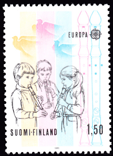 Diese Europamarke 1985 aus Finnland (MiNr 968) zeigt Kinder, die Blockflöte spielen.