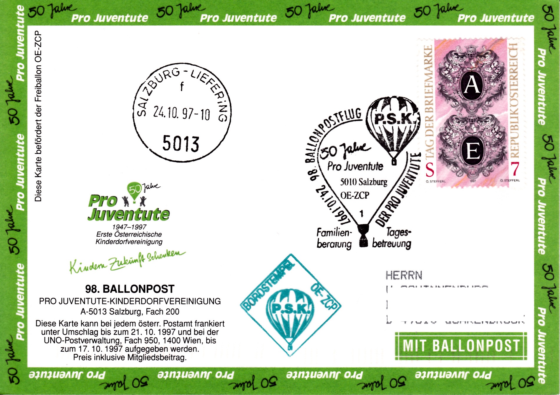 Auf dieser Karte wurde die Marke als Frankatur für die 98. Ballonpost der Österreichischen Pro Juventute verwendet.