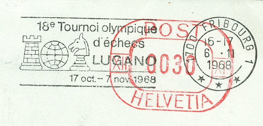 Springer und Turm macht ein Maschinenstempeleinsatz der Stadt Freiburg/Schweiz (Amtssprache ist Französisch, daher "Fribourg") noch am 6.11.1968 darauf aufmerksam. Das Turnier war fast schon zu Ende.