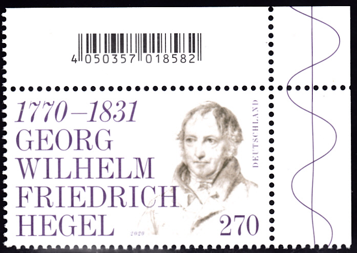Zum 250. Geburtstag von Georg Wilhelm Friedrich Hegel verausgabte die Deutsche Post eine Marke (MiNr 3560) mit seinem Porträt. Hier zeige ich ein Eckrandstück mit EAN-Code.
