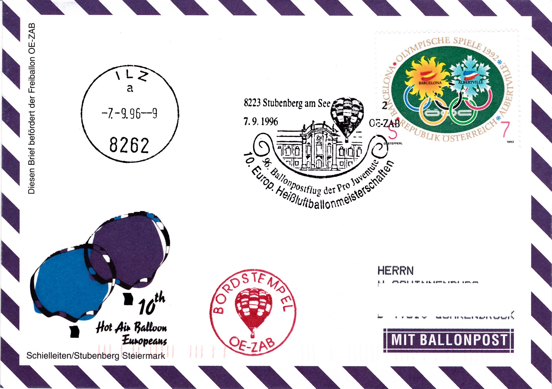 Die Marke aus Österreich (MiNr 2048) zu den Olympischen Winterspiele 1992 in Albertville und den Olympischen Sommerspiele 1992 in Barcelona ist auf diesem Brief als Porto für einen Umschlag mit Luftschiffpost der Österreichischen Pro Juventute verwendet worden.