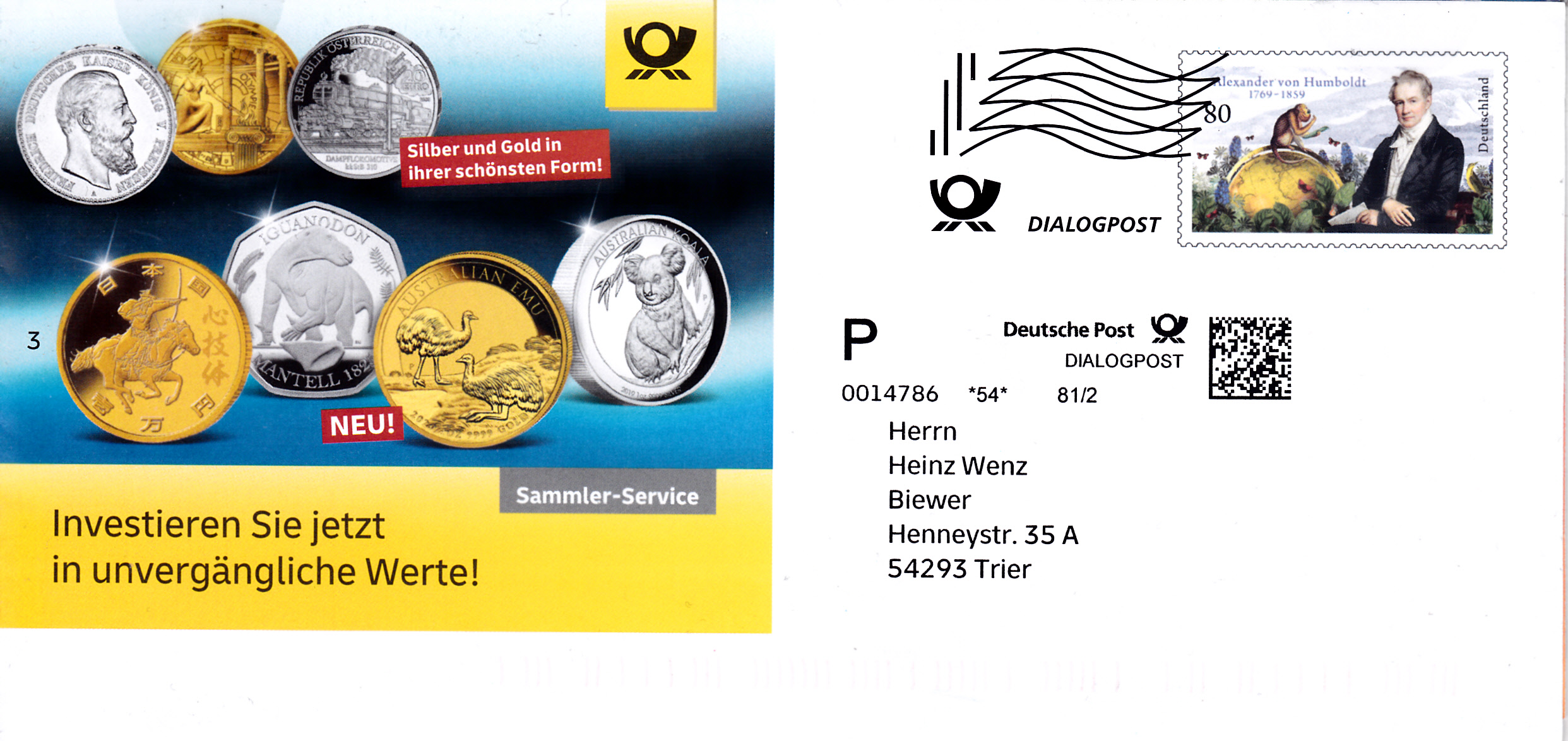Faltbrief 210 mm x 102 mm mit Wertstempel der 80 Cent-Marke 250. Geburtstag von Alexander von Humboldt (MiNr 3492) mit aufgedruckter Zähnung. Der Wertstempel ist mit einer Welle "Dialogpost" entwertet.