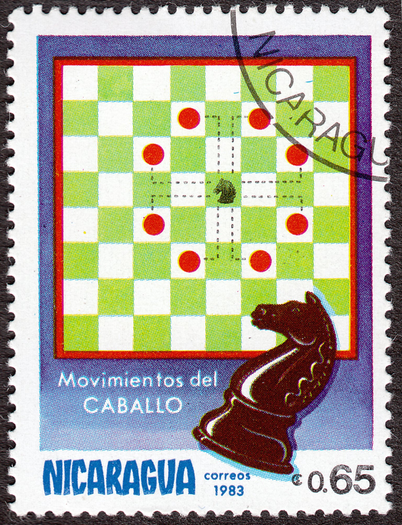Diese Marke aus Nicaragua zeigt die aktuellen 8 Zugmöglichkeiten, die der dargestellte schwarze Springer von dem Feld auf dem Schabrett aus hat, auf dem er gerade steht: