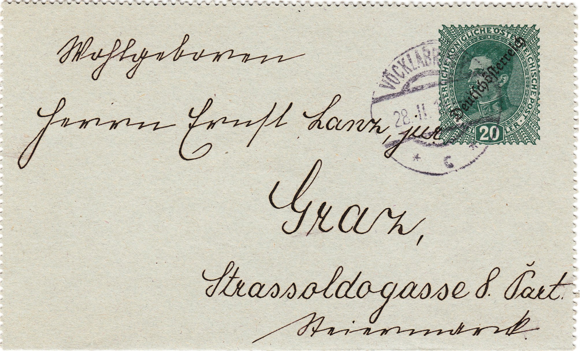 Dieses am 28.02.1919 von Vöcklabrunn nach Graz geschickte Exemplar eines Kartenbriefes trägt den Eindruck eines Postwertzeichens mit dem Porträt von König Karl I., das mit einem Aufdruck "Deutschösterreich" versehen wurde: