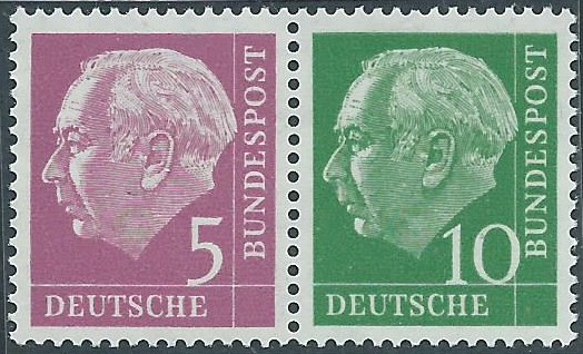 Waagerechter postfrischer Zusammendruck 5 + 10 Pf, Michel-Nummer W 19 Y. Leider kann ich mit meiner bescheidenen Technik das Wasserzeichen Y hier nicht bildlich darstellen, es ist aber auf diesem Zusammendruck vorhanden.