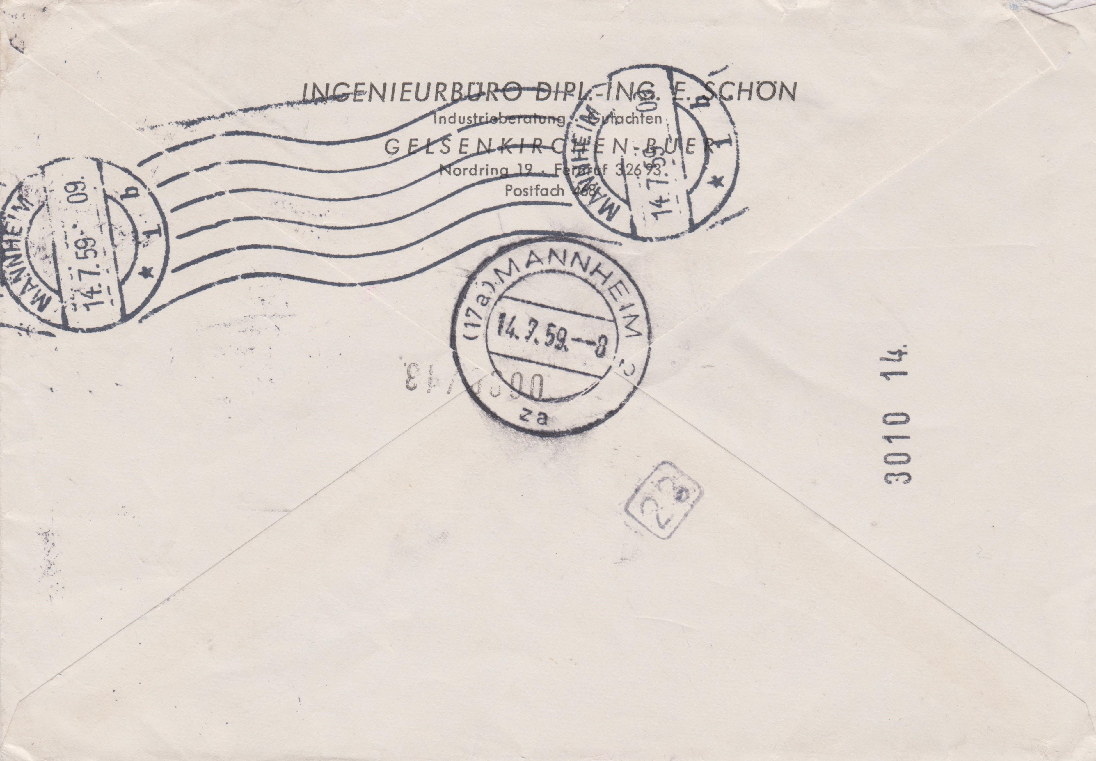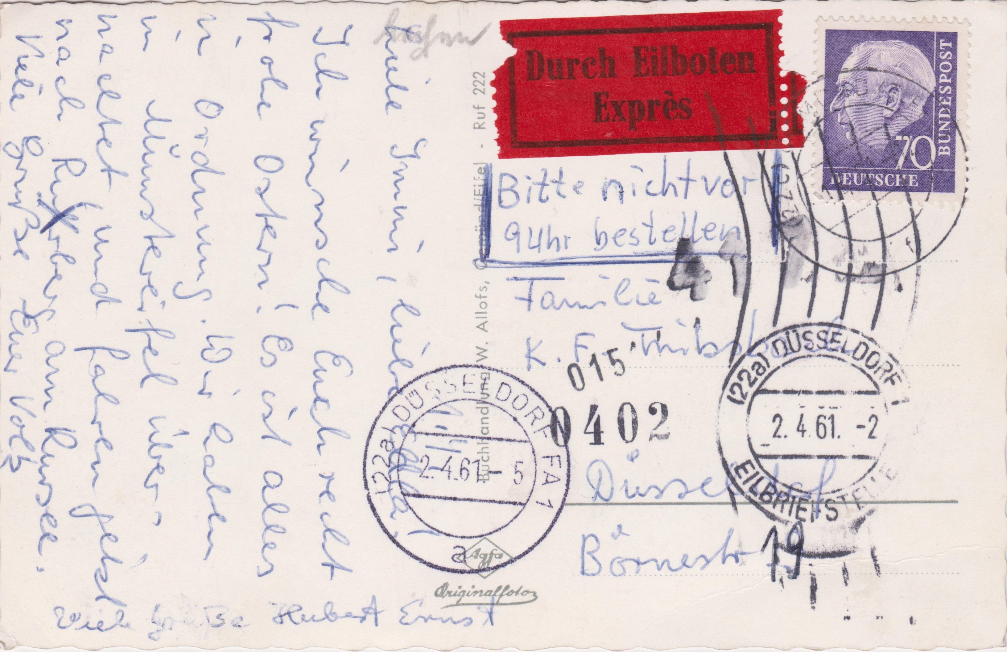 Interessant ist der Handdurchlaufstempel "(22a) DÜSSELDORF 1 EILBRIEFSTELLE", der am 02.04.1961 um 2 Uhr morgens abgeschlagen wurde!