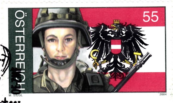 Auf dieser Marke aus Österreich (MiNr 2503) aus Anlass "50 Jahre Österreichisches Bundesheer" sehen wir Vizeleutnant Horst Konrad mit einem Schutzhelm.