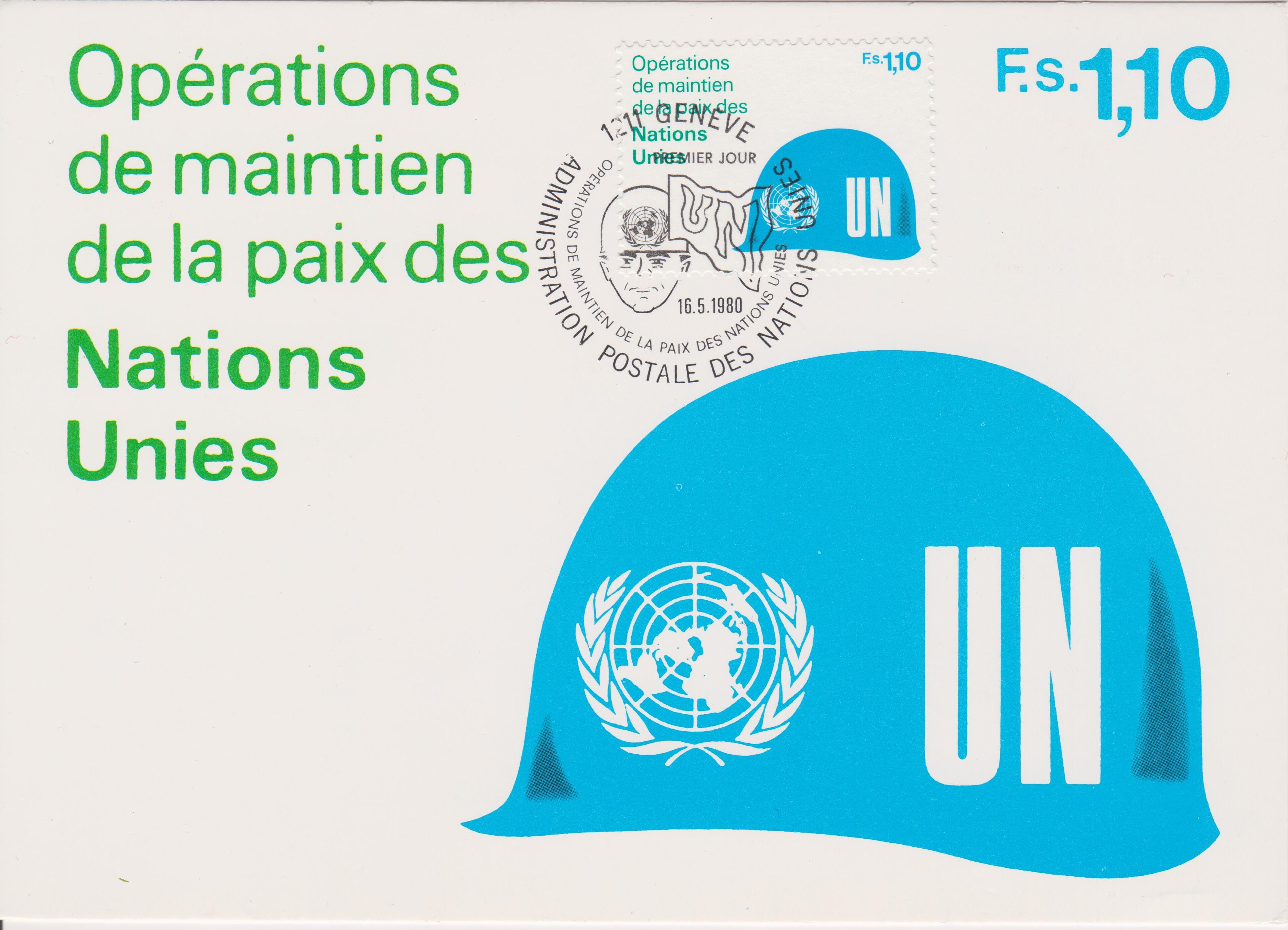Ein UN-Blauhelm diente als Motiv dieses Postwertzeichens der UNO Genf, hier auf einer motivgleichen Maximumkarte mit thematisch passendem Sonderstempel entwertet: