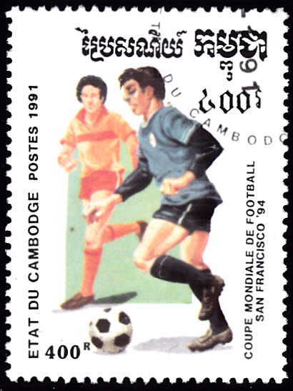 In Kambodscha ist bereits 1991 eine erste Markenserie zu den Fußball-Weltmeisterschaft 1994 in den USA erschienen. Ob bei der Darstellung auf dieser Marke (MiNr 1196) einer der beiden Spieler den Ball trifft?