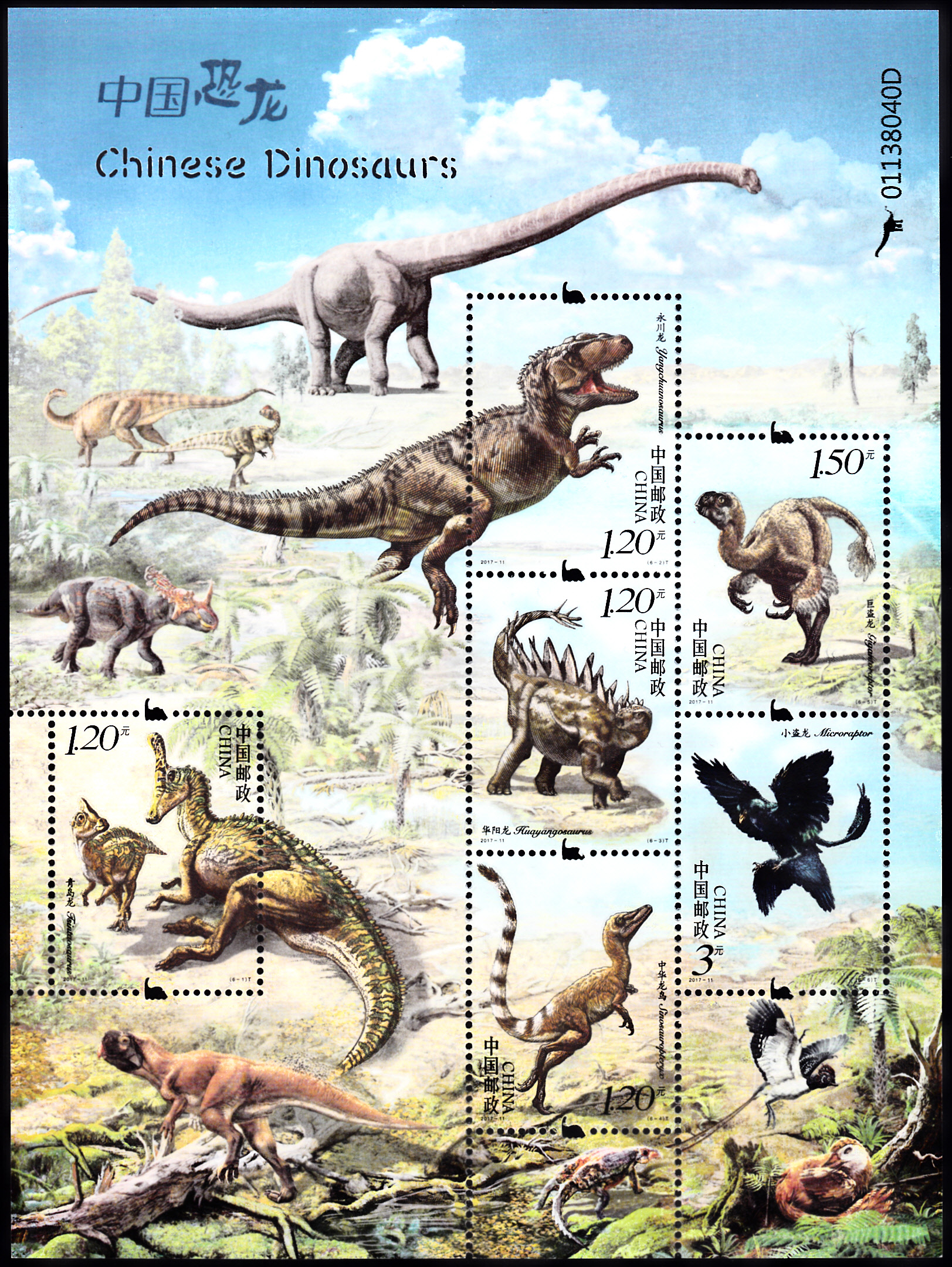Die letzte Marke der Serie aus der Volksrepublik China (MiNr 4898) zeigt einen Microraptor.