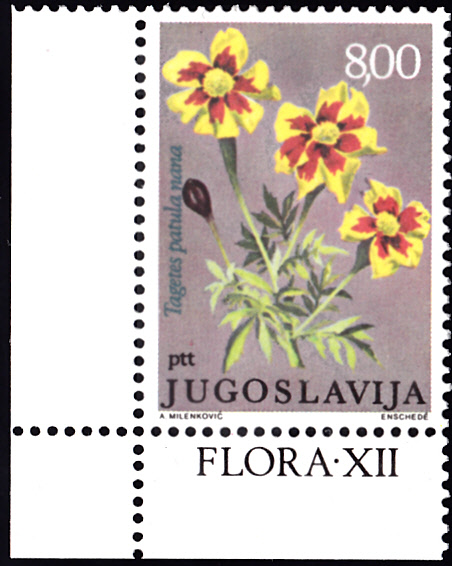 Auf diese Marke aus Jugoslawien (MiNr 1680) werden Blüten der Art Tagetes patula nana (vermutlich eine Züchtung) gezeigt. Bei Michel wird als Name Ausgebreitete Sammetblume (Tagetes patula nana) angegeben.
