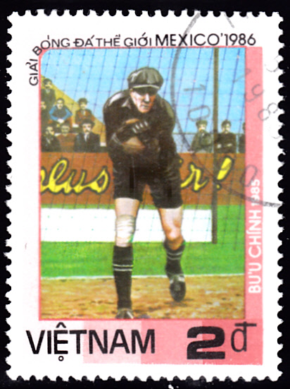 Aus der gleichen Serie aus Vietnam zur WM 1986 stammt diese Marke (MiNr 1635) mit einem Torwart bei einer Parade.
