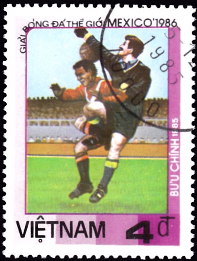Aus einer bereits 1985 erschienen Serie aus Vietnam zur WM 1986 stammt diese Marke (MiNr 1633) mit einem Torwart vor einem Stürmer. Ob er den Ball noch erreicht?
