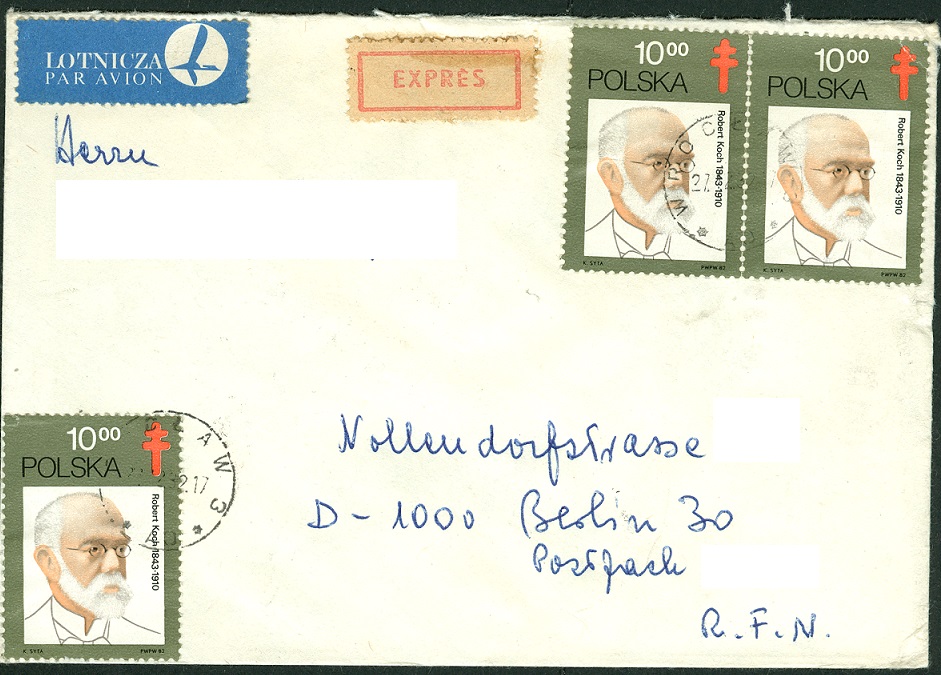 Der Beförderungsweg verlief nämlich über Frankfurt am Main. Weil nicht nur "Exprés", sondern auch "Luftpost", verfrachtete man diesen Brief wohl in die nächste Maschine nach Deutschland, wahrscheinlich einer polnischen Fluglinie, und das war dann allem Anschein nach eine nach Frankfurt/Main und nicht eine nach Berlin. Also durfte diese Eilsendung auch noch von Frankfurt nach Berlin fliegen. Beide Flüge im Jahre 1983 für 65 Sloty. ... Wenn sich das rumspricht, wird Flugreisen im Umschlag bald der Renner. ;)