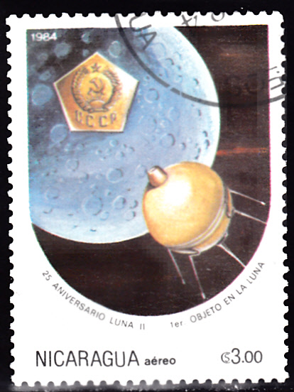 1984 erschien in einer Serie "Jahrestage der Weltraumfahrt" in Nicaragua diese Marke (MiNr 2501) mit Luna 2 vor dem Mond.