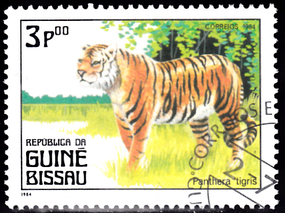 Es folgt eine Marke aus Guinea-Bissau (MiNr 779) mit einem Tiger (Panthera tigris).
