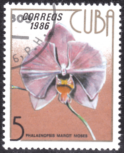 Eine weitere Marke aus der gleichen Serie aus Kuba zeigt eine Zuchthybride mit dem Namen Phalaenopsis margit moses.