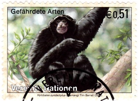 Auf einer Marke der Postverwaltung der Vereinten Nationen in Wien (MiNr 357) können wir einen Siamang (Hylobates syndactylus) sehen.